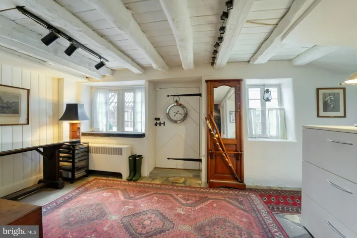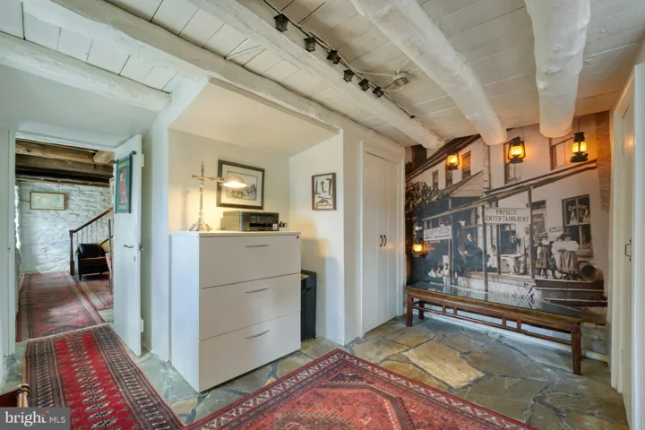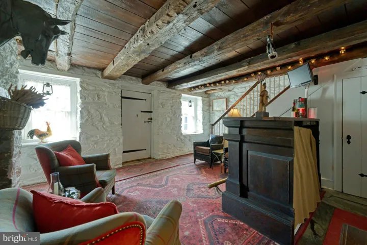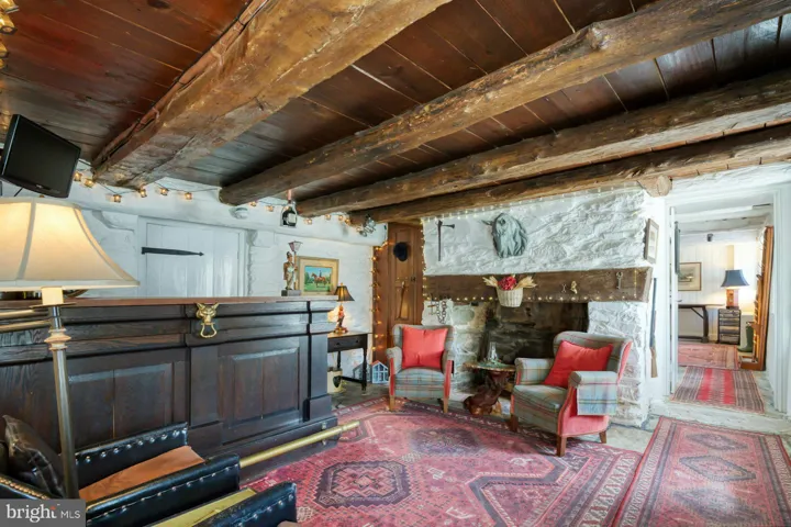 The first floor welcomes you with a twin set of entryway doors that open into the original tavern spaces which feature a beamed ceiling, stunning stone floors and stone walls and a cozy fireplace surrounded by wood cabinetry.