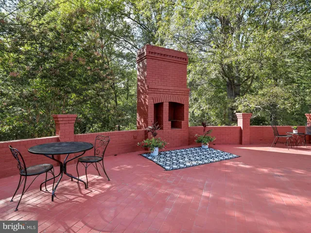 Grand Entertainer’s Patio: Expansive outdoor living area with a brick fireplace, tons of seating/entertaining space, and surrounded by mature landscaping for privacy.