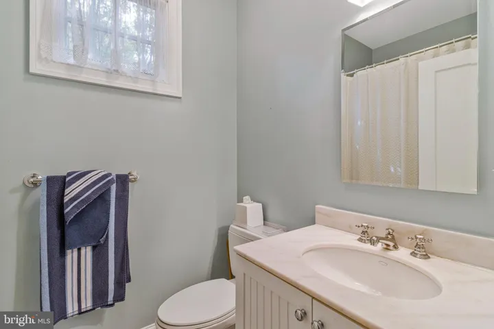 The family room showcases a coffered ceiling, built-in cabinetry, retractable TV, surround sound, recessed lighting, and dark hardwood floors. French doors open to a 5’ x 21’ deck overlooking the backyard and driveway. A formal dining room flows seamlessly into the family room, while a cozy sitting room off the foyer offers plantation shutters and a decorative hearth. A main-level office features custom built-ins, surround sound, and plantation shutters. A full bath with a pedestal Kohler sink, Toto toilet, custom tile shower with seat, and wainscoting completes this level.