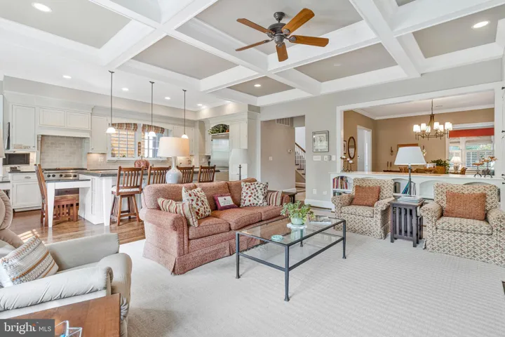 The heart of the home is the open concept island gourmet kitchen with crown molding, opening to the family room, anchored by a Wolf 4-burner range with griddle, Sub-Zero refrigerator/freezer with icemaker, Sharp under-counter microwave, incognito-panel dishwasher, and a stainless undermount sink with retractable faucet. Dark granite counters with AG edging, self-closing cabinetry, pendant and recessed lighting, and a charming eat-in area with built-in bench seating and storage create a warm and functional space.