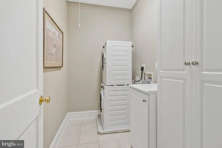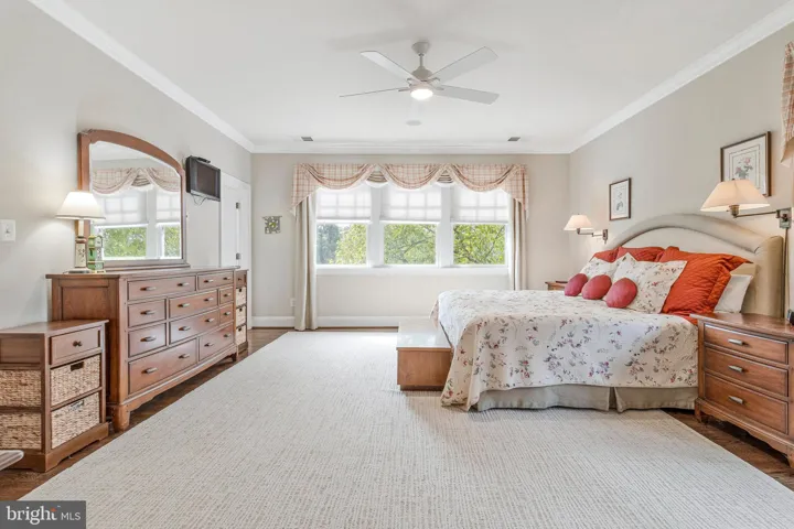 A large central hallway with crown molding and a custom carpet runner leads to three spacious bedrooms, including a luxurious owner’s suite with a separate sitting room, double closets, built-in bookshelves, and a large walk-in closet with custom storage. The spa-like primary bath boasts marble tile, a glass shower with dual handheld faucets, a double vanity with marble counters, and a private water closet. Two additional bedrooms—each with hardwood floors, ceiling fans, and ample closets—share a marble-topped hall bath. A convenient laundry area with a Blomberg washer and dryer, cabinetry, and attic access completes the upstairs.
