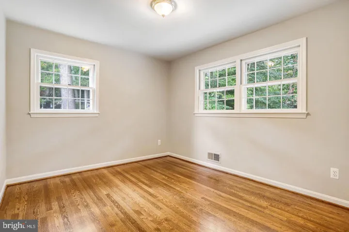 Enjoy spacious living with hardwood floors throughout the main level, a bright living room with a bay window and fireplace, a separate dining area leading to a covered deck, and a modernized kitchen with solid-surface counters and gas appliances. The primary suite combines two bedrooms into a luxurious retreat with dual closets, while two additional bedrooms provide versatility.