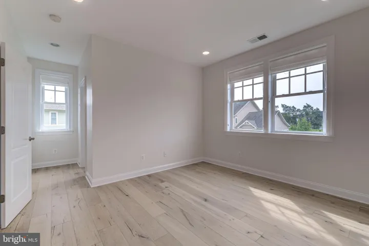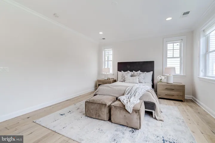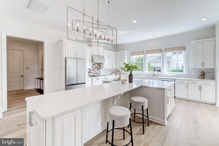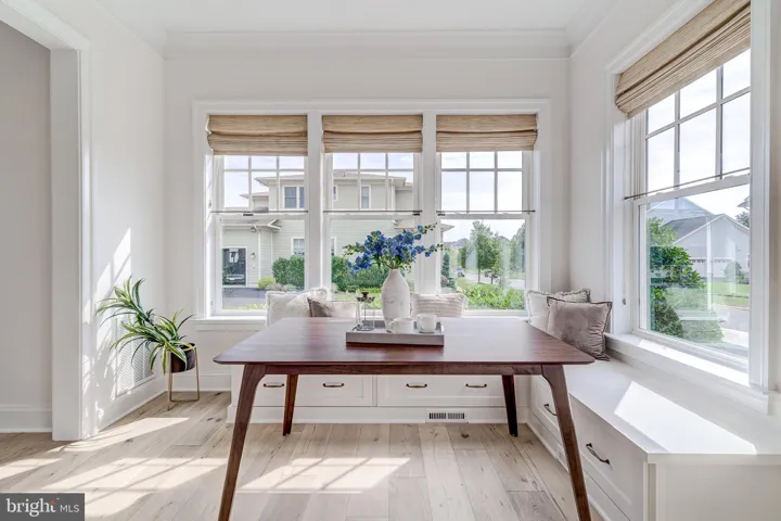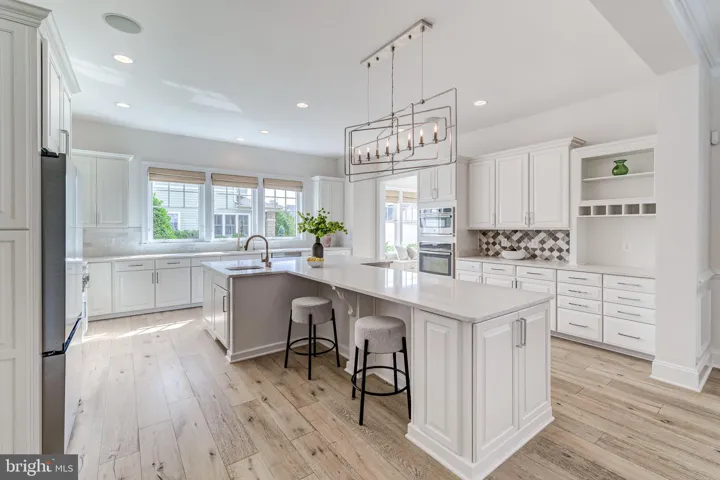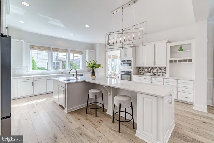 Inside, 10-foot ceilings and wide-plank oak floors span the main and upper levels, setting a tone of refined elegance. The chef’s kitchen boasts crisp white cabinetry, quartz countertops, and a large island that opens to a sunlit family room—ideal for both relaxed living and hosting. Off the kitchen, a breakfast room with a custom built-in bench provides a charming space for casual dining. A flexible main-level den or living room adds versatility, while the oversized three-car garage leads into a thoughtfully designed mudroom with abundant storage. A full bathroom on the main level enhances both convenience and functionality.