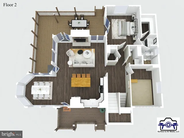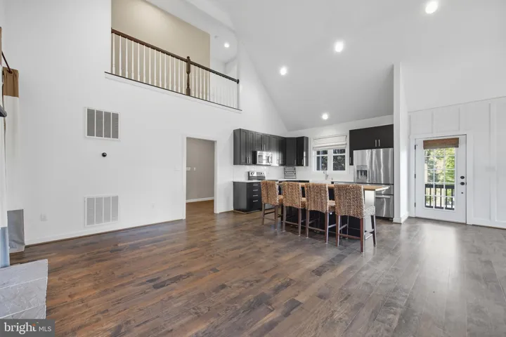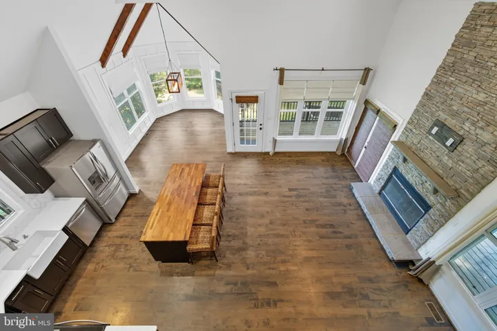 Step inside to discover rustic charm paired with modern comforts—gleaming hardwood floors, vaulted ceilings, and a striking stone fireplace anchor the great room. The kitchen is a chef’s dream with quartz countertops, farmhouse sink, stainless appliances, tile backsplash, a spacious island with bar seating, and a cozy dining nook highlighted by a wood beam ceiling.