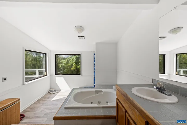 Nestled in the desirable Ashcroft neighborhood, a unique mountainside setting located minutes to Downtown, I-64, hospitals, and shopping. Natural light abounds in this stunning, spacious contemporary on 1.5 private acres, with expansive decks framed by seasonal Blue Ridge views and mature trees. Fenced yard is perfect for pets. This 4BR/3BA home features soaring ceilings, and an open floor plan with dramatic stone fireplace in the living room. The chef in your family will enjoy the kitchen with its large island ideal for gathering and great for entertaining. The primary bedroom suite evokes the feel of a treehouse retreat, featuring large walk-in closet, luxury jacuzzi bath, and its own private deck for enjoying your morning coffee among the treetops and mountains. Generously sized bedrooms, with large closets and ceiling fans. The lower level features a large family room with built-in shelves, ideal for a theater or playroom, the fourth bedroom or guestroom, and full bath with laundry. Expansive two-car garage with cabinets and workspace. With access to Ashcroft?s miles of walking trails, pool, tennis, and clubhouse, this home offers the best of mountain living with the convenience of town just minutes away.,Glass Front Cabinets,Solid Surface Counter,Wood Cabinets,Wood Counter,Fireplace in Great Room