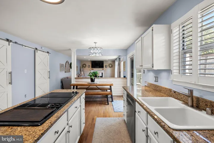 Inside, you’ll find cozy yet spacious rooms filled with natural light throughout the day. The kitchen features a center island with a cooktop, custom barn doors, and flows seamlessly into the inviting living spaces. Special touches include wall paneling, recessed ceiling lights, an updated fireplace surround, and custom-built dressers for added function & charm.
