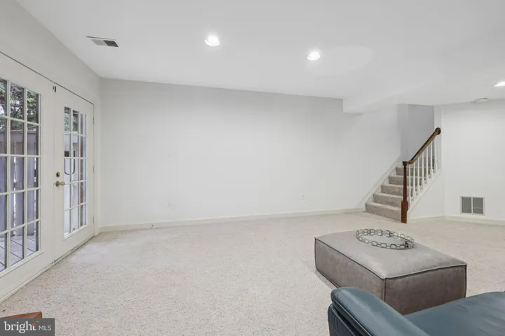 Lower Level: Spacious rec room with a second fireplace. Third full bath and laundry room. French doors open to private, wooded patio. Garage entry.