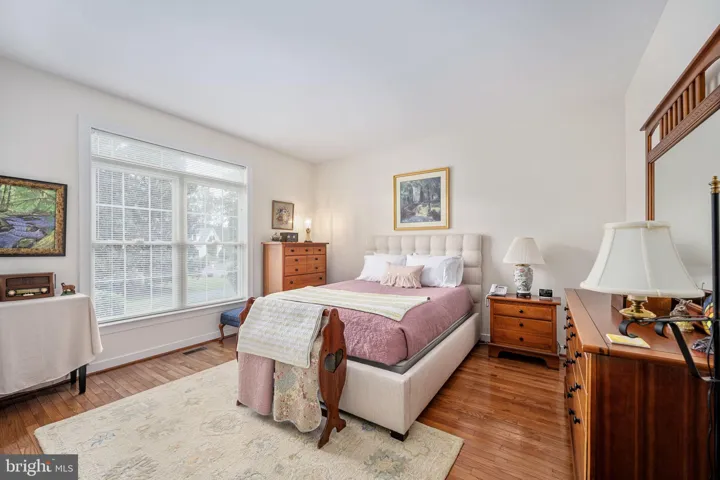 The primary suite is a luxurious retreat featuring hardwood flooring, a tray ceiling, two walk-in closets, and a private bump-out sitting area. Its ensuite bath offers a luxurious soaking tub, stand-alone shower, and dual vanities. An additional bedroom with hardwood floors and 2 double-door closets is served by a well-appointed full bathroom with a tiled shower/tub combo and double vanity. A third bedroom on the main level—currently styled as a home office—features a full closet, providing flexibility as a guest suite or study.