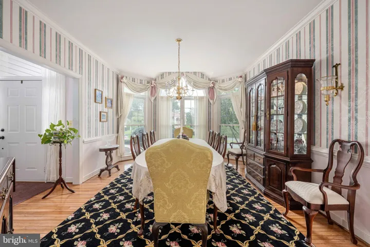 The formal living room sets the tone with a soaring cathedral ceiling and hardwood flooring, creating a bright and inviting space. The formal dining room continues the elegance with crown molding, a bay window, and hardwood floors.