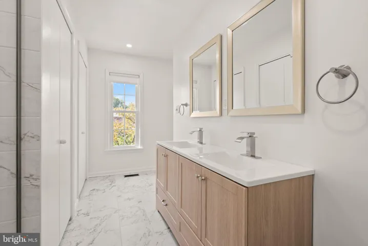 Upstairs, you’ll find three generously-sized and comfortable bedrooms with original hardwood floors. The primary suite boasts a spectacular, never-used bathroom (2025) with a double vanity, zero-threshold shower, and elegant tile finishes–gorgeous!