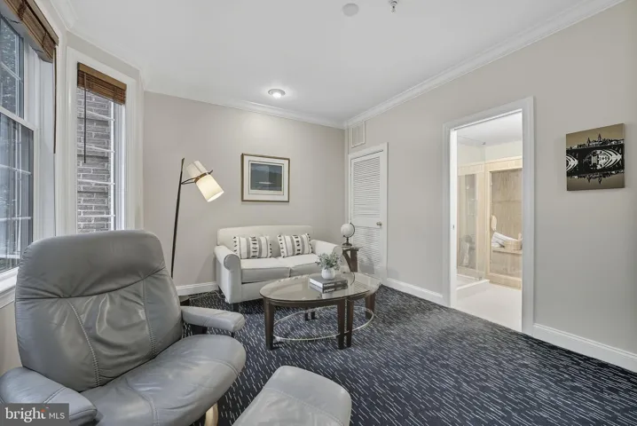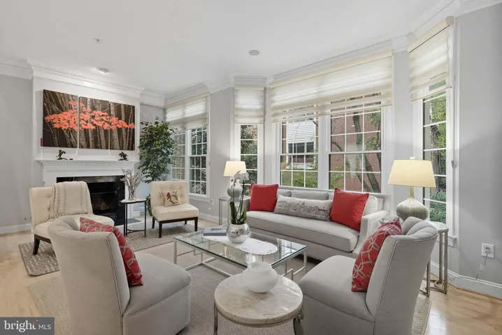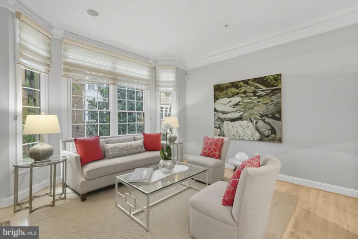 Escape the bustle of the city and enjoy a sense of calm as you walk along the quiet, tree-lined path leading to the home’s charming garden entry. Inside, the space feels both refined and welcoming. Crown molding and beautiful hardwood floors add timeless elegance to the main living areas, while custom zebra shades on every window provide adjustable light and privacy.