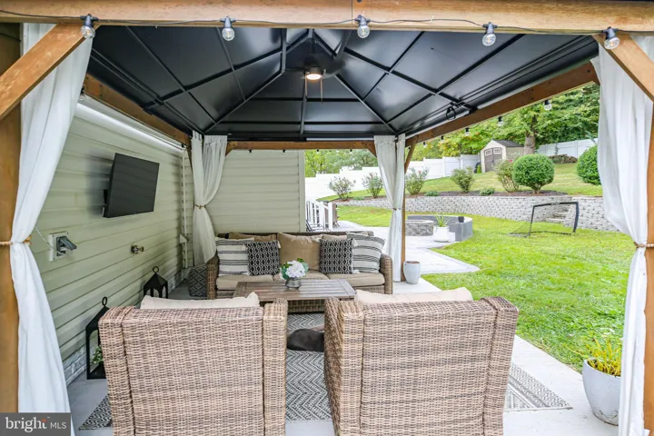 The backyard is a true retreat – fully fenced with white vinyl fencing, professional landscaping, and retaining walls. An expansive stamped concrete patio and a covered pergola with TV provide perfect spaces for outdoor dining, entertaining, or relaxing.