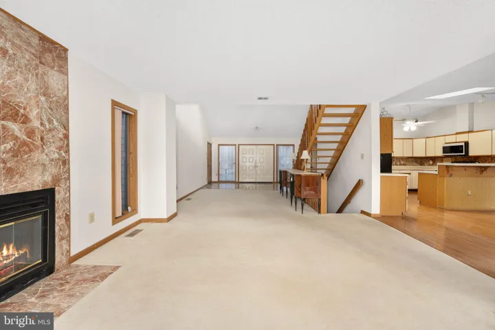 The dramatic two-story foyer with marble flooring leads you into the living room and out to an