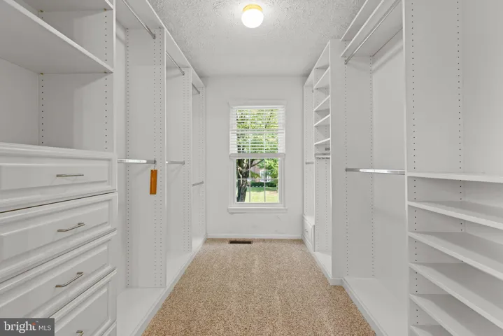 Upstairs there are four spacious bedrooms, each with custom closets by Closets by Design. The primary suite offers vaulted ceilings and a large walk-in closet, while the renovated bath includes travertine tile, a soaking tub, walk-in shower with bench, and dual vanities with ample storage and counter space.
