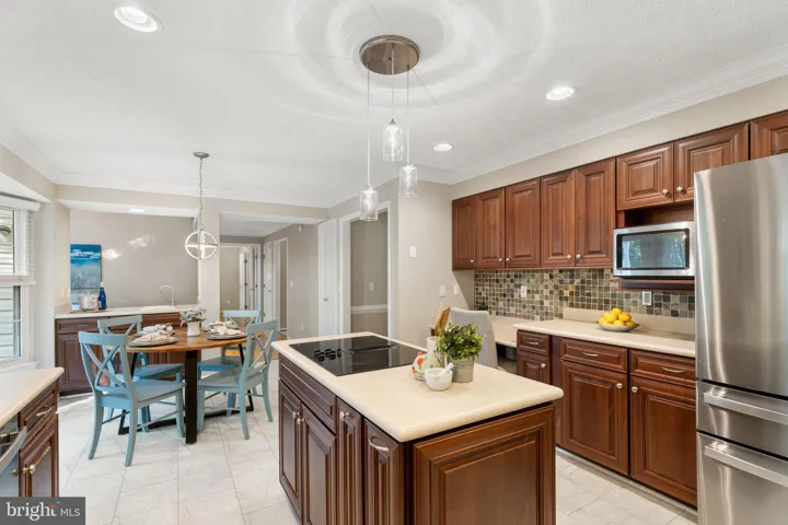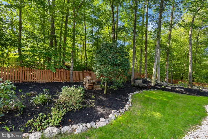 The renovated kitchen features a custom backsplash, center island with downdraft cooktop, double wall ovens, bayed breakfast area, pantry, built-in desk, wet bar, and a box-bay over the kitchen sink. A French door steps out to the freshly stained deck, perfect for summer dining. The main level also includes a half bath and laundry room with rear foyer area leading to the freshly painted 2 car garage.