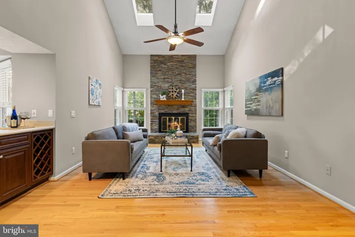 The wrap-around porch sets a welcoming tone. Inside, fresh paint, updated lighting, and hardwood floors create an updated feel. The elegant formal dining room has both chair rail and crown molding. The spacious living room connects to a main level office with windows overlooking the backyard waterfall and koi pond. The heart of the home is the bright and open two-story family room with skylights and a stone gas fireplace flanked by windows.