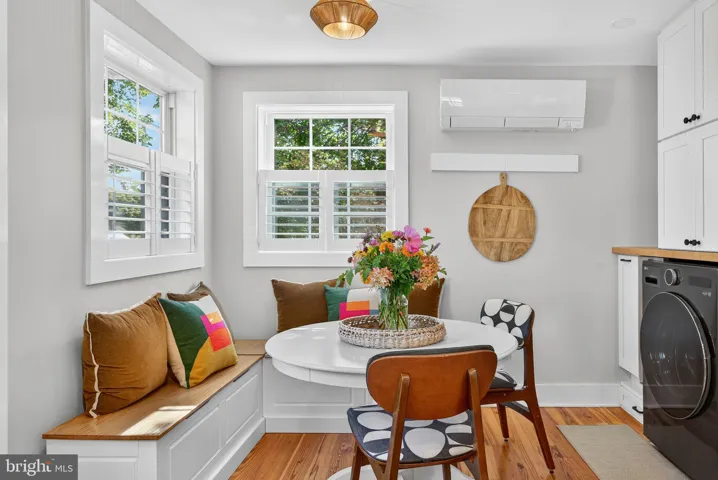 The main level unfolds into a light-filled, open-concept living space, anchored by a gourmet kitchen with granite countertops, soft close cabinets, and stainless steel appliances. Built-in bench seating in the dining area adds charm and hidden storage, while the main-level laundry offers everyday ease. A jewel-box powder room with radiant heated floors adds a refined touch of indulgence.