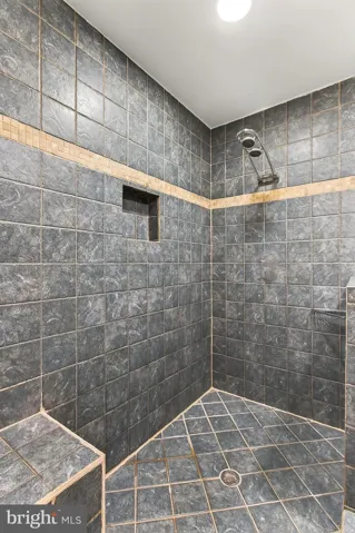 Down the hall from the living room is an updated full bath with porcelain floors that serves the two regular bedrooms. The primary suite has its own private bath with granite counters, dual sinks, and tiled walk-in shower. There is also a door from the primary suite to the rear deck.