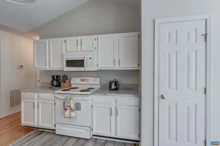 Peaceful living in the heart of Charlottesville! Tucked away in this centrally located neighborhood, this one level villa home provides a quiet sanctuary while being minutes from 5th St. Station, Wegmans, UVA and downtown. The open floor plan flows seamlessly from the large renovated eat-in kitchen with granite countertops, updated white cabinets, and new dishwasher and microwave. Formal dining area and lovely living room with soaring vaulted ceiling, and sliding doors leading out to the private back patio. The primary bedroom features two large closets and an updated ensuite bathroom with new vanity, commode, and showerhead. A second spacious bedroom with full bath that is great for guests and an additional room that can be used as an office, playroom or guest room round out this warm sun-filled home. This home features a new roof and one car garage too! Professionally landscaped with mature hedges and seasonal flowers. Neighborhood amenities such as walking/running trails, a playground, and pool are within walking distance.,Granite Counter,White Cabinets