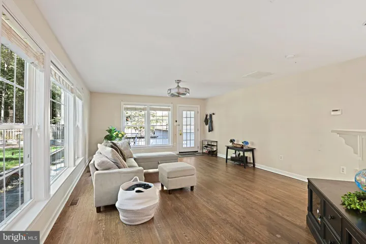 On the main level, the living room is filled with natural light from a wide bay window, giving the room an open, cheerful feel all day. The wood-burning fireplace anchors the space—quiet mornings with coffee, cozy evenings with family. A true formal dining room sits nearby, ready for birthdays, holidays, or simple weeknight dinners. The kitchen is the heart of the home, with skylights that brighten the space, an island that naturally gathers people, generous counters and cabinetry, and a walk-in pantry. What makes it special is how open it feels to the family room—lined with windows that frame the backyard and invite the outdoors in. From here, step right out to the Trex deck and the huge, private, fenced yard. The flow from kitchen to family room to outside is easy and natural. Beautiful hardwood floors tie this level together.