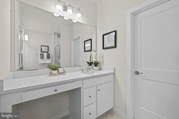 Upstairs, the spacious primary suite offers a large walk-in closet and spa-like en suite bath with a glass-enclosed walk-in shower, bench seating, and dual vanities. Two additional bedrooms share a full bath with double sinks and a tub/shower combo.