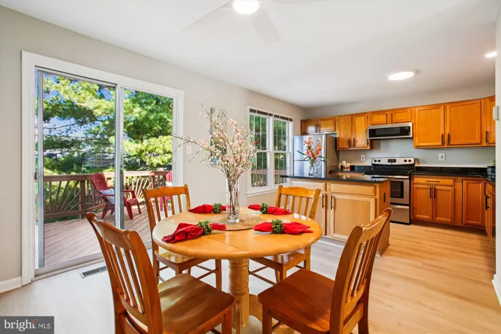 Step inside to an airy, light-filled living room with seamless new plank flooring that flows into the open dining area and refreshed kitchen. You’ll love the sleek new black granite countertops, matte black contemporary hardware on timeless oak cabinets, stainless steel appliances (including a new fridge, microwave, and dishwasher), plus a prep island and new sink and faucet. From here, sliding doors take you to a spacious deck—perfect for outdoor dining and entertaining—overlooking a generous yard with front, side, and back garden space.
