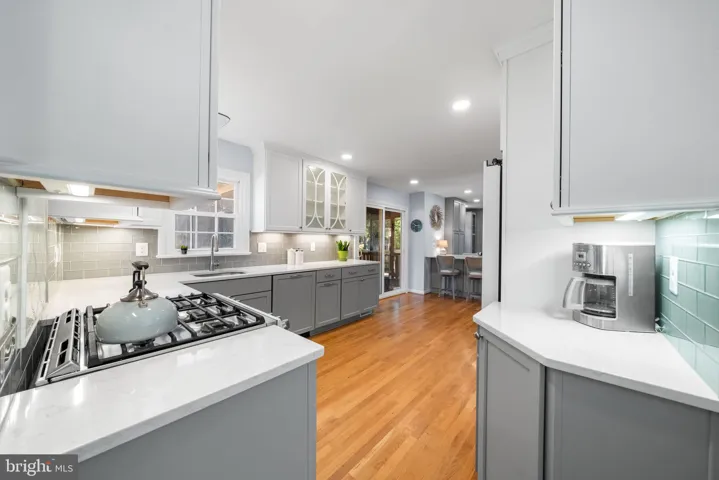 The main level offers a rare and convenient bedroom with a full bath—perfect for guests or multigenerational living. The heart of the home is the stunning gourmet kitchen featuring quartz countertops, GE Café appliances, a gray glass subway tile backsplash, custom cabinetry, and an oversized island that seats four. Custom cabinetry continues into the adjacent living space, offering the perfect setup for a stylish home office.