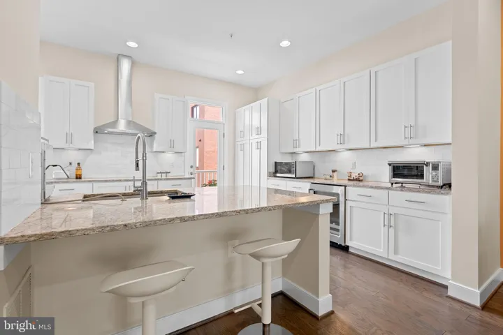 Welcome to 608 E Alexandria Avenue, a beautiful townhouse on a tranquil street in Potomac Yard. The first level features a bedroom and full bathroom, as well as a two-car garage wired for 240-volt car charging. Upstairs is the heart of the home, offering an open floor plan between the living, dining and kitchen areas, and a powder room. The kitchen boasts granite countertops and stainless steel appliances, gorgeous cabinetry that provides ample storage, a large breakfast bar, and off the kitchen is a lovely balcony. The upper level features two bedrooms and two full bathrooms; the spacious primary bedroom has two large closets and an en suite that has a double vanity. On the top floor is a recreation room with a wet bar, a washer/dryer area, and a sunny rooftop terrace, perfect for entertaining. Throughout this freshly painted home are stunning wood floors and designer light fixtures. Other upgrades include LED lighting, dual zone heating/cooling with smart Ecobee thermostats, and a high efficiency tankless water heater.