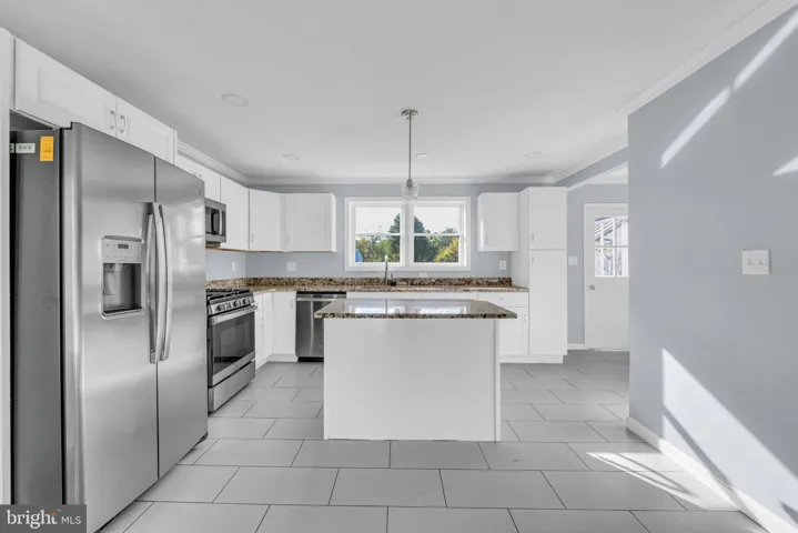 Modern kitchen with stainless steel appliances, granite counters, large island, and new cabinets