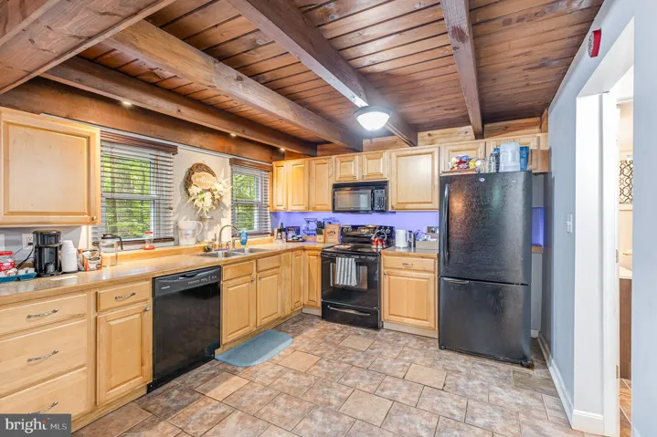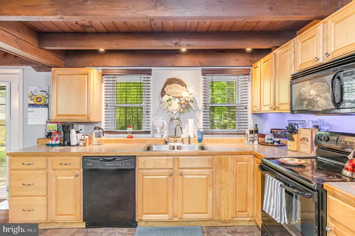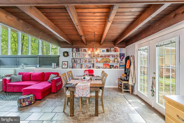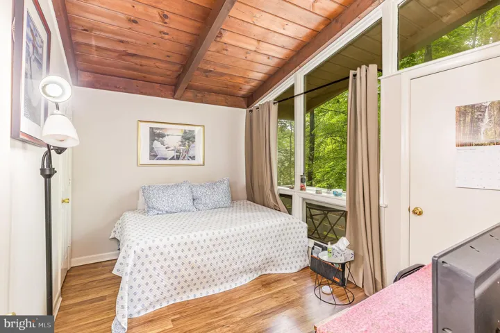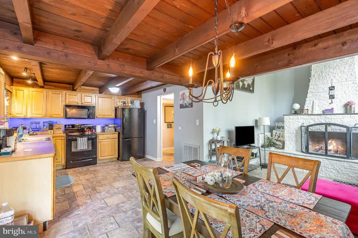 Step into the main living space, where vaulted wood-paneled ceilings, expansive windows, and a classic white brick fireplace create a warm, sunlit atmosphere—perfect for enjoying nature’s views year-round.