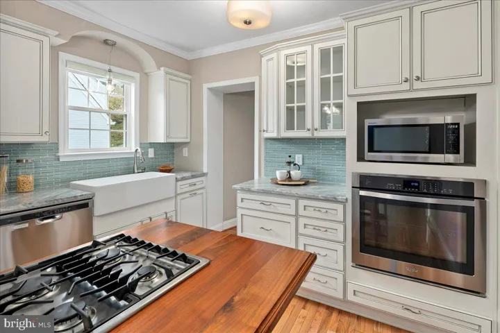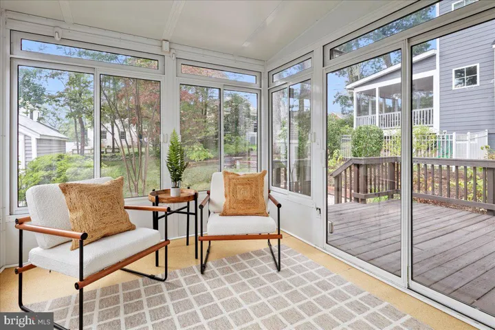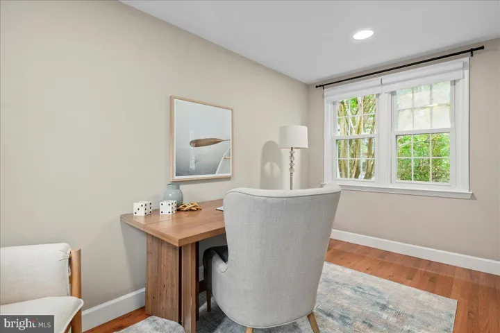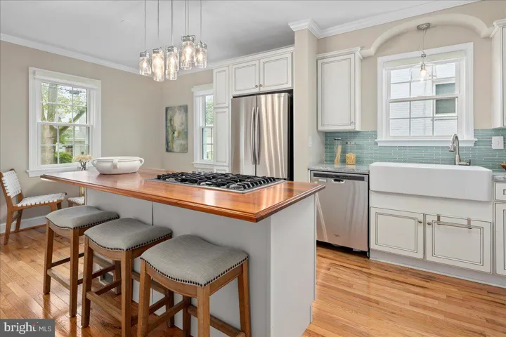 Step inside this light-filled home and discover a thoughtfully designed floor plan. The main level features a formal dining room with a wood-burning fireplace framed by built-in bookshelves, a home office, and a remodeled kitchen with Carrara marble countertops, farmhouse sink, pendant lighting, tile backsplash, a mahogany-topped island bar, and a cozy breakfast nook. Adjacent to the kitchen, the spacious living room with recessed lighting and a second fireplace  flows seamlessly into an inviting sunroom—perfect for relaxing or entertaining—all set on warm hardwood floors throughout.  There is a powder room located off the living room.