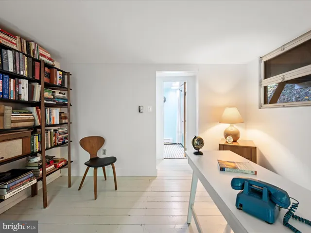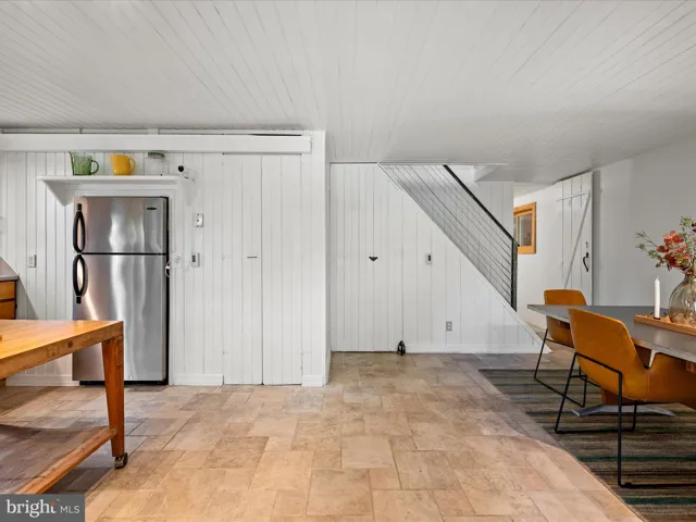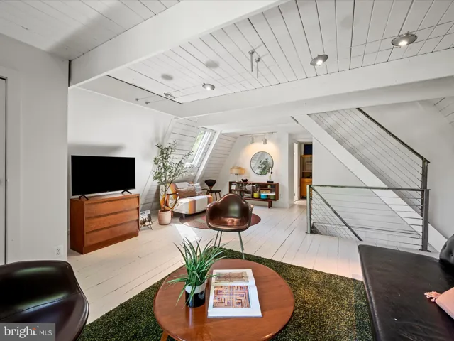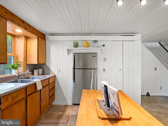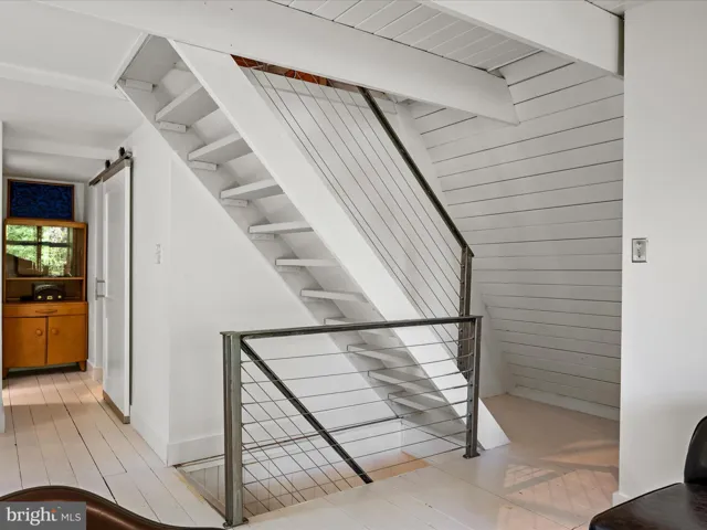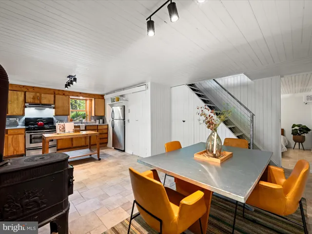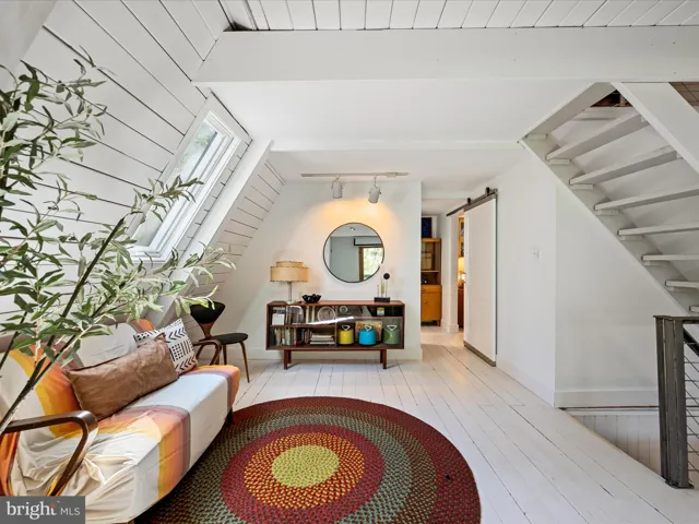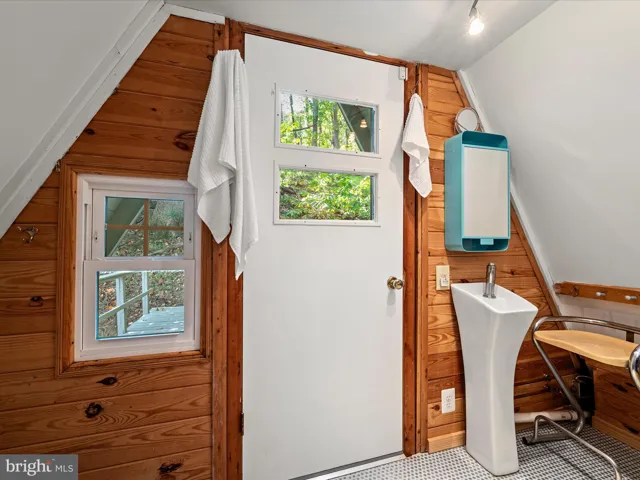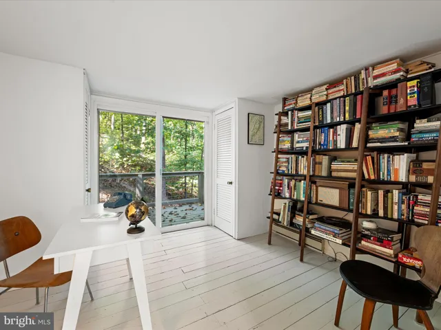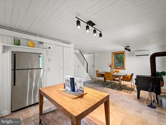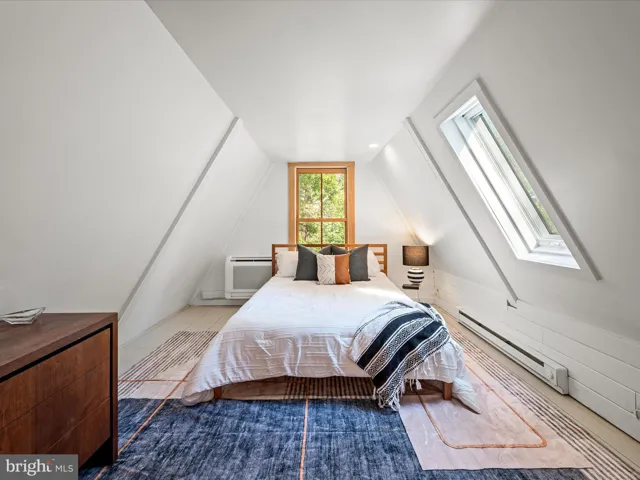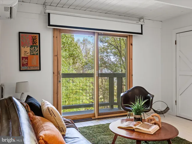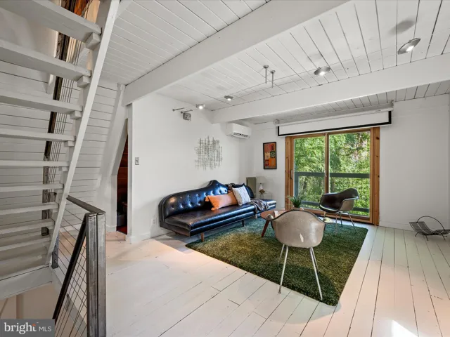 Inside, you’ll find a creative blend of mid-century modern style and handcrafted touches — from the handmade wire railings to the fresh paint and new mini-split system that keeps every level comfortable. The main floor offers a kitchen and dining space, a bedroom, and a full bath. On the middle level, a cozy family room opens to a front balcony overlooking 20 acres of private wooded land, and a second bedroom (currently an office) opens to its own side deck. Upstairs, the third bedroom feels like a treehouse all its own, with a private back deck and half bath.