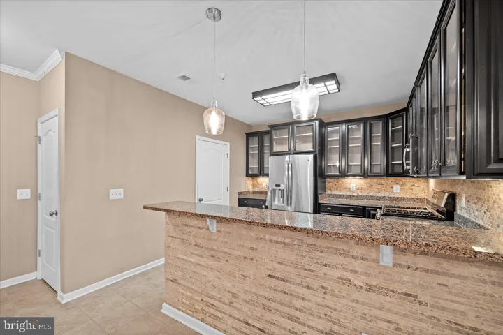Step inside to a bright, open-concept layout with spacious living and dining areas designed for both entertaining and everyday living. The gourmet kitchen has been beautifully updated with glass-door cabinets, tile backsplash and barstool wall, extended granite countertop for casual dining, decorative cabinet end panels, under-cabinet lighting, pendant fixtures with dimmer switches, and an upgraded pantry shelving system. A new gas range (2025) completes this chef’s space.