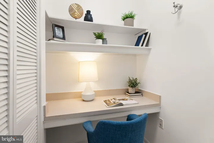 The chef-inspired kitchen is equipped with sleek Corian countertops, a chic bar area, gas cooking, and abundant storage within 42″ cabinets. A thoughtfully designed built-in office nook offers an ideal space for working from home, and the full-size washer and dryer add everyday convenience.