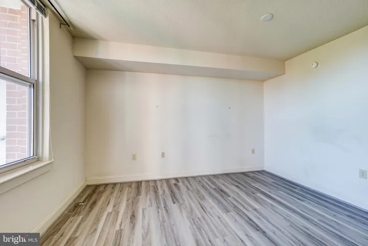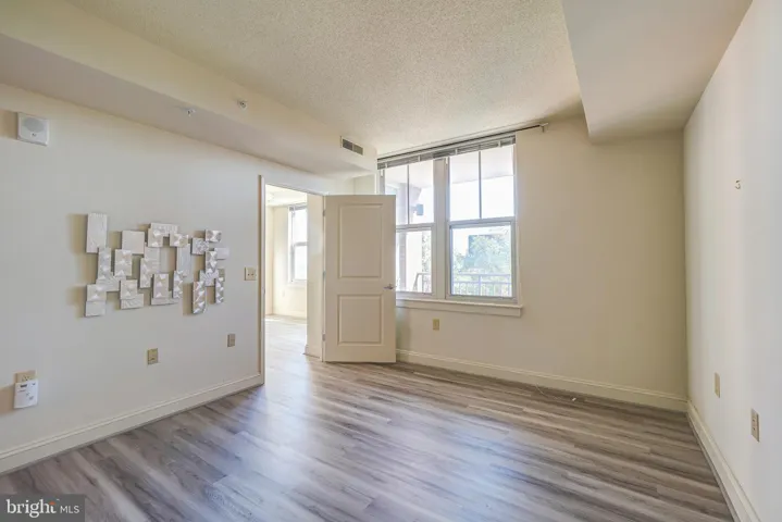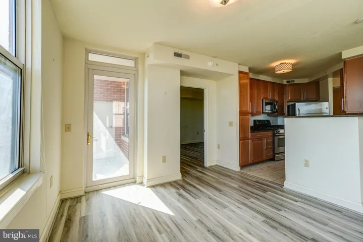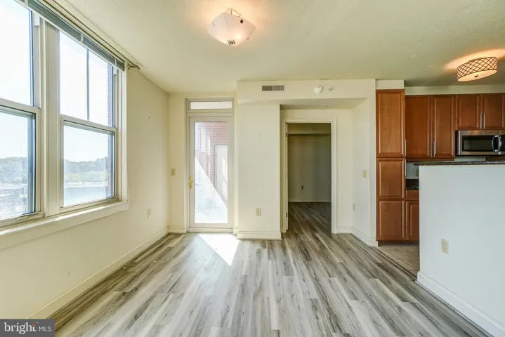 Sunlit living space with floor-to-ceiling windows and private balcony offering panoramic views stretching to Tysons Corner