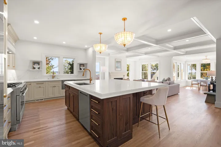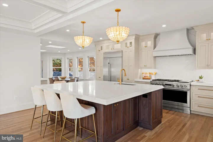 At the heart of the home, the chef’s kitchen—designed by St. Clair Kitchens—combines artistry and function with custom inset cabinetry, a 100-inch walnut island, and dramatic 2.5-inch Calcutta quartz countertops finished with a coved Dupont edge and matching floating shelves. Top-tier appliances include a 48-inch gas range, 42-inch French-door refrigerator, dual dishwashers, three sinks, an ice maker, and a separate wine refrigerator.