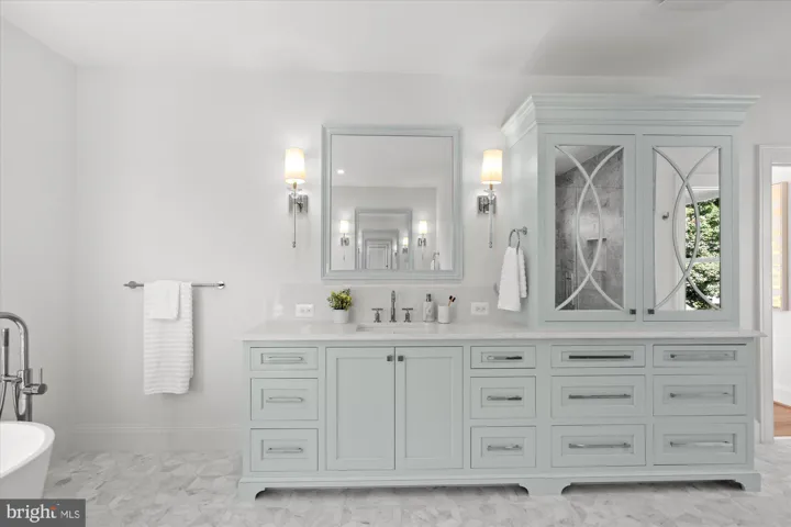 The two-car garage is equally refined, featuring a custom double bay door, 10-foot ceilings ideal for a golf simulator, pull-down attic storage, original slate roof, and gas line rough-in for a future outdoor kitchen or grill.