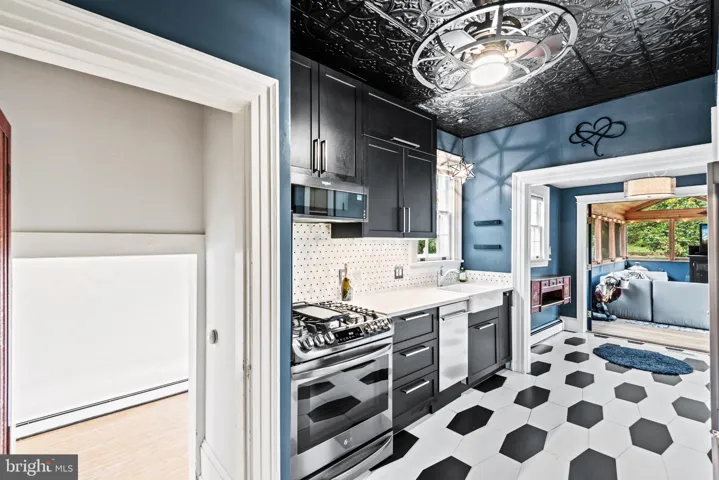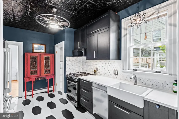 Kitchen- New Tin Ceiling Fandelier – New Cabinets with Under Cab Lighting – New Tile Flooring & Back splash