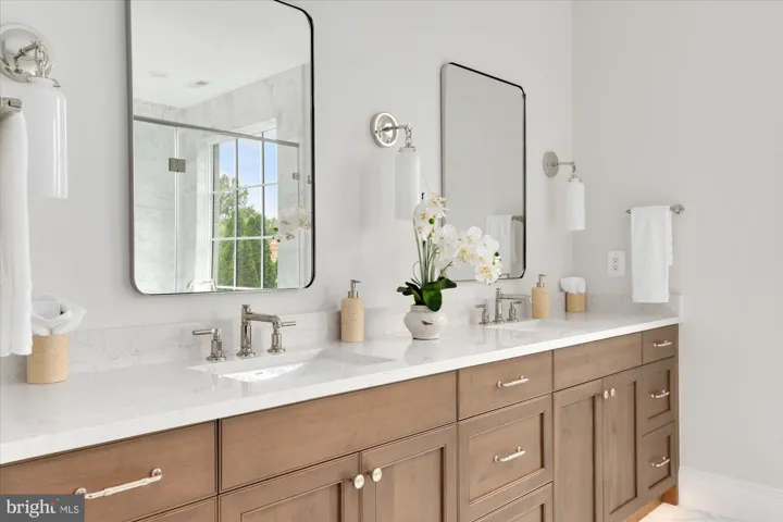 Cherry Hill Custom Homes presents this exceptional new home in the sought after Potomac Hills neighborhood of McLean. Prominently sited on an elevated .37 acre lot, this transitional Tudor design is accentuated by elements of brick, and stone, and beautiful floor-to-ceiling Weather Shield windows. The home features 6 bedrooms, 7 full bathrooms, and one powder room with 7,485 square feet of thoughtfully designed living space over three levels. The main level includes 10ft ceilings, gorgeous wide-plank engineered white oak wood floors, a beautiful gourmet kitchen with frame-less custom cabinetry, quartz countertops, and paneled Thermador appliances. The kitchen opens to a great room with exposed beams and a linear gas fireplace with tile surround, wood mantle, and flanking built-ins. Adjacent to the kitchen is a spacious dining room with coffered ceiling and tons of natural light. The bluestone screened porch with motorized screens and flush-mounted heaters provides an amazing outdoor living space overlooking the flat backyard with plenty of room for a swimming pool. A guest suite, private study with fireplace and built-ins, separate powder room, a stunning floating staircase, and a large bluestone front porch round out the main level living spaces. The upper level is highlighted by a luxurious primary suite with dual walk-in closets with built-ins, a spa-like bathroom with heated floors, double vanities, stand-alone soaking tub, and heavy glass enclosed shower. The walk-up lower level includes a recreation room with walk behind wet bar and wine room, a home gym with rubber flooring. an en-suite bedroom, two mudrooms with connectivity to the oversized two car garage and the areaway, a separate laundry room, and an additional full bathroom. This home has a built-in elevator shaft for optional conversion. Convenient Highlands Swim and Tennis Club, The Pimmit Run Park and trail system, and Chesterbrook Shopping Center. Chesterbrook ES/ Longfellow MS/ McLean HS.