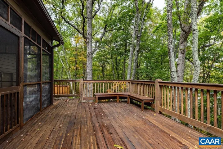 Spacious and inviting, this Wintergreen home offers main-level living with a bright great room featuring cathedral ceilings and a dramatic floor-to-ceiling stone wood-burning fireplace. The open dining area flows seamlessly into a spacious kitchen with granite countertops and a cozy breakfast nook that opens to a screened porch?perfect for enjoying mountain breezes. The large primary suite includes a walk-in closet and private office. Outdoor living shines with an expansive 850-sq-ft rear deck plus a welcoming front porch. A 2-car garage, rarely found at Wintergreen, adds convenience. The lower level offers four bedrooms?or use three bedrooms plus a large den or bonus room. The home sits on a rare 2.46-acre lot backing to open space, providing privacy and beautiful mountain and sunrise views from early November through early May. The exterior was freshly painted and the deck stained in 2025, and the home conveys turn-key furnished?a fantastic value with space, comfort, and seasonal views.,Granite Counter,Oak Cabinets,Fireplace in Great Room