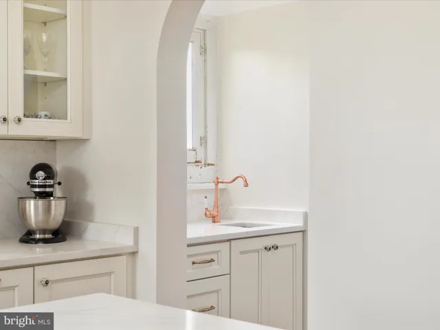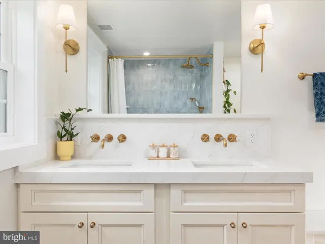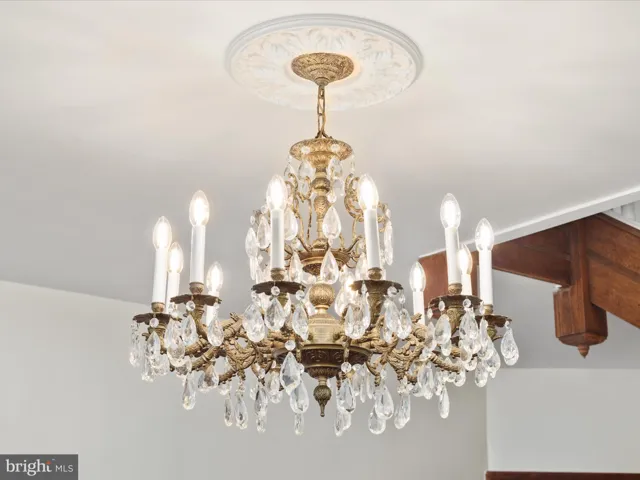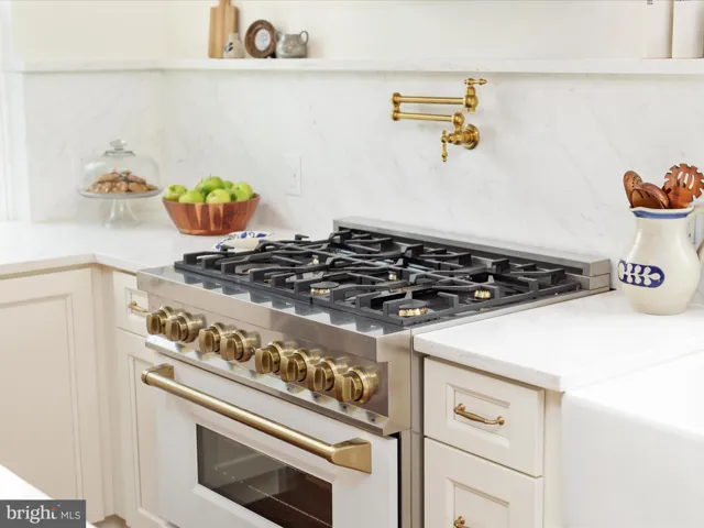 The living room offers a cozy gas fireplace, perfect for quiet evenings or gatherings. The kitchen is a true showpiece—featuring a professional-grade range, elegant quartz countertops, brass fixtures, a statement chandelier, and a cabinet-covered dishwasher that blends seamlessly into the cabinetry. A walk-in pantry with a second sink adds both function and style.