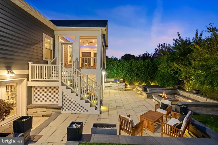 Backyard is a show stopper! 950 sqft masonary patio; extending living space outdoors! The concrete paver path to side, enhanced by beautiful landscaped bushes & outdoor rock speakers, is set from driveway to extensive hardscape, highlighting fire pit, seating arrangment around, hot tub, bar w/barbeque grill & ref, & sitting area tucked under deck hooked for TV connection, Bose speakers, & an outdoor fan. Two sizeable under deck storage areas, w/one of them w/gas connected stove & grill. Ample lighting at patio & greenspace, flood lights, & boundless number of outdoor planters w/water sprinklers. Irrigation system installed to keep lawn & flower beds lush & green. Huge screened-in deck off of great rm thru patio door & its stairs thru storm door to backyard; deck features Bose speakers, ceiling fan, & roller shades to keep it cool in summers. Fenced yard w/mature tree line for exceptional privacy. Oasis of space & vibe for entertaining.