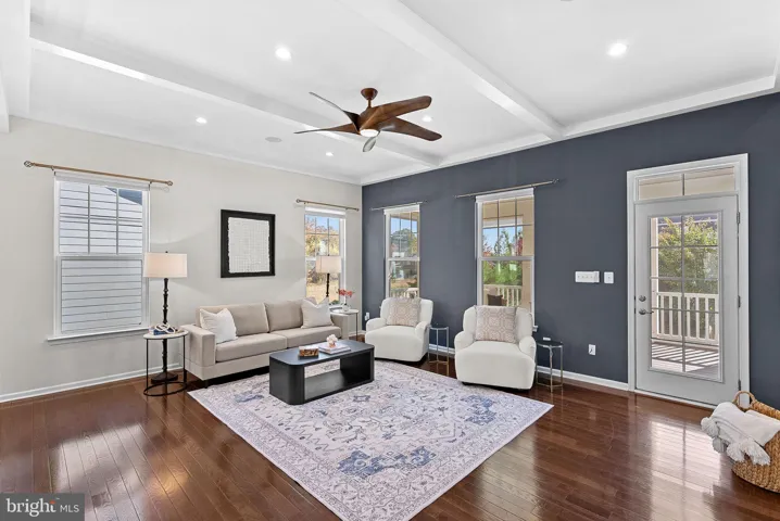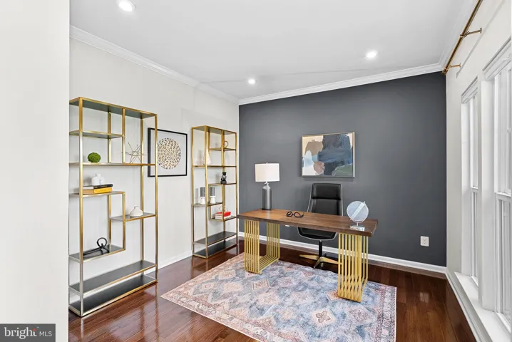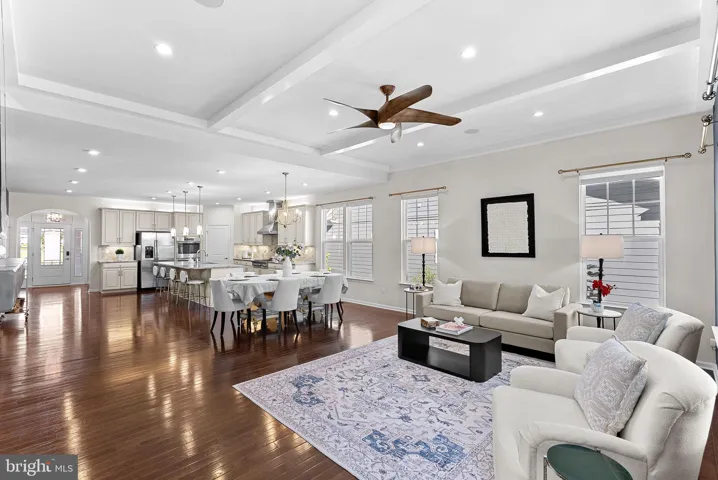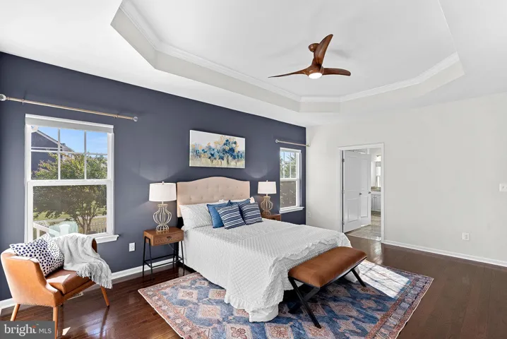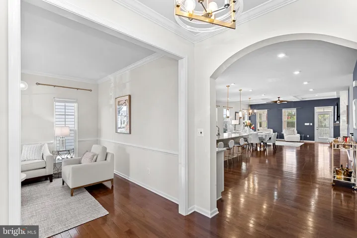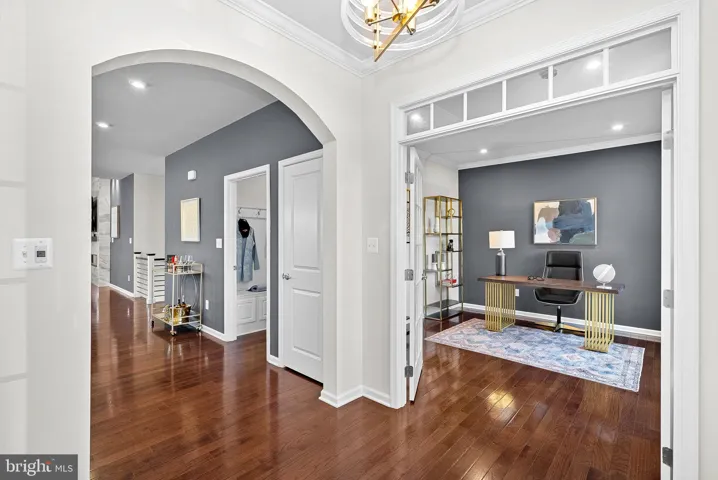 Home welcomes you w/rich hardwood floors, vibrant accent walls, delightful light fixtures, & recessed lights throughout, allowing a warm texture. A cased opening to living, & French glass doors w/transom to library, on either side of foyer, accomplishes the formal touch. An archway at foyer adds an architectural interest, setting tone to casual part of home, seamlessly. Fine details include crown moldings, chair railing, trims, beam, & tray ceilings. Natural sunlight gushes thru long windows that are adorned w/high end drapery rods & custom blinds. Kitchen is a chef’s delight! Timeless cabinets w/brass hardware, under&up cabinet lighting, pendants, gourmet w/upscale SS appliances, granite counters, tile backsplash, undermount sink, gigantic center island, & pantry. Kitchen smoothly flows to dining, & effortlessly to great rm; the heart of home where linear gas fireplace w/mantle, marble tile to ceiling, stylish fan, & ceiling speakers, becomes an ideal space for cozy gatherings. Breezing thru hall area, grand primary suite w/large walk-in closet, trendy fan, spa-inspired bath featuring dual vanities, glass shower enclosure, linen closet, & private water closet. To continue, two secondary bedrms that share a hall bath. Convenience aspect, laundry w/cabinets at main level! Mud area w/cubbies completes it!