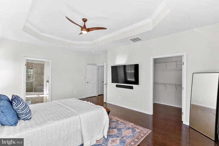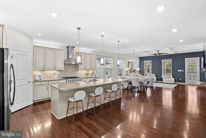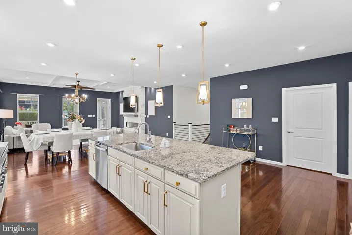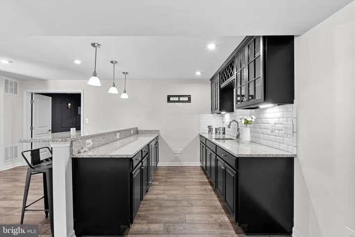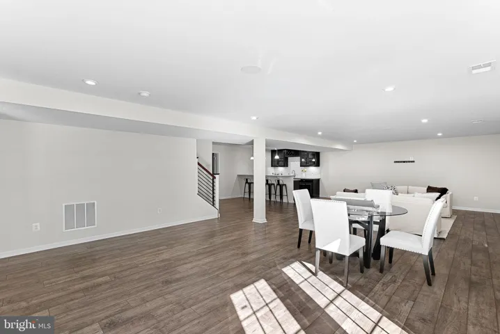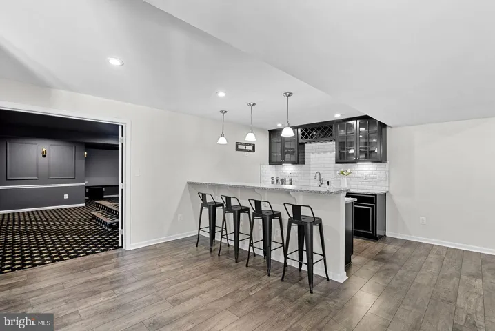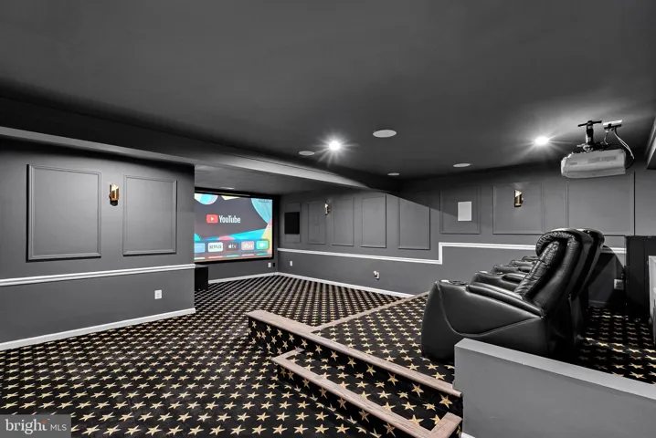 Wide open modern oak staircase to lower level laid w/LVP floors. Enormous rec area w/numerous TV locations, & ceiling speakers. Wet bar w/buffet island, pendants, under cabinet lighting, granite counters, sink, subway backsplash, glass cabinets, & wine rack. Vast fourth bedrm w/walk-in closet & dual entry full bath. Exercise rm w/closet to start your day! Wait to immerse & experience recently completed exquisite 3D sound home theater; 9.2 Dolby Atmos, a high-end surround system configuration! All ceiling & wall speakers convey. Movie theme carpet, wall scones & moldings, offer the ambience! Wide double door walkout exit to magnificent backyard.