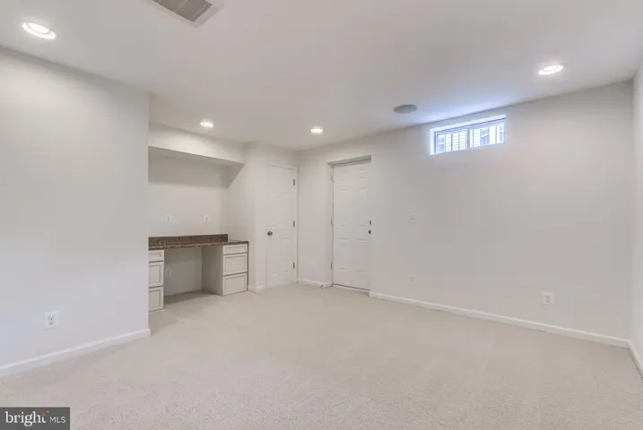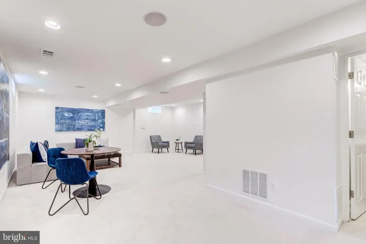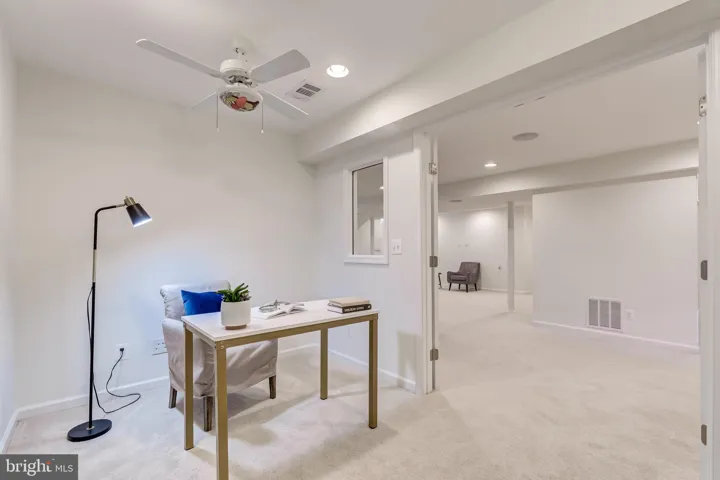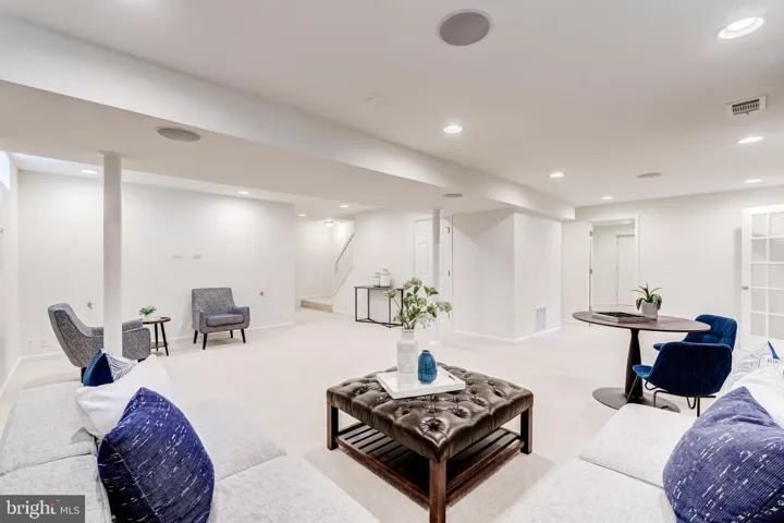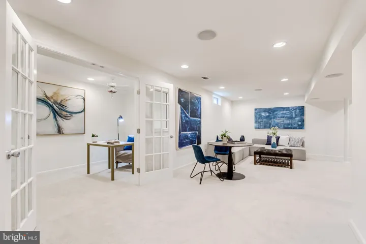 The finished lower level offers flexible living with a large recreation area, built-in speakers, and a private office framed by French doors. A full bath, walk-up exit, and legal fifth bedroom make this level ideal for guests or multi-purpose use.