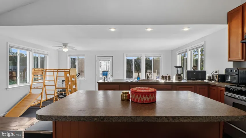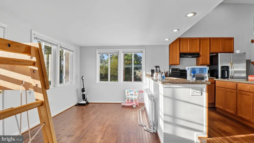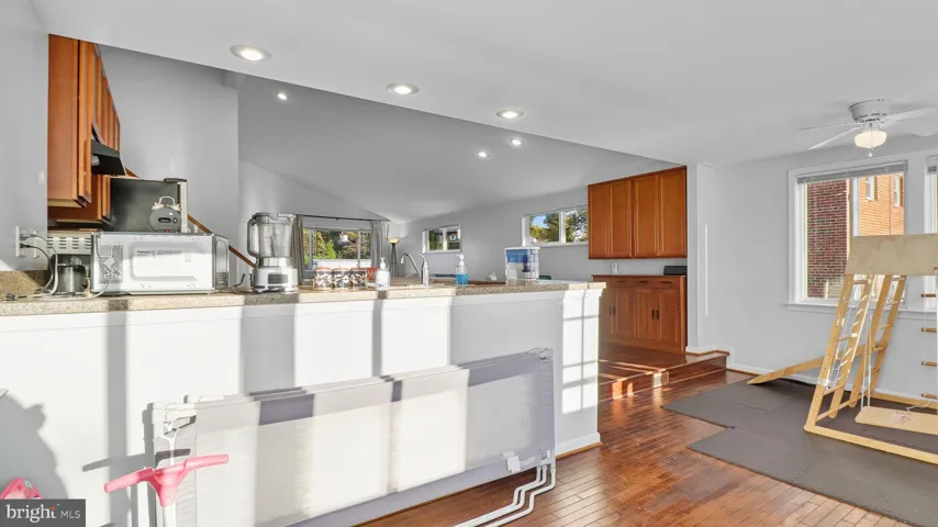 Renovated with an impressive open floor plan, this mid-century split level combines its 50’s vibe with a contemporary flair. Cathedral ceilings in the living-dining room area give an airy feel, and the open kitchen lets everyone join the conversation. An addition in the rear, open to the main area, has windows on every wall, and a door goes out to the back yard. Upstairs, 3 bedrooms share an updated bathroom that retains its black-and-white retro appeal. The main level and the bedrooms all have hardwood floors. The lower level has a half bath, bonus room, laundry and utility room, and door to the one-car garage.
