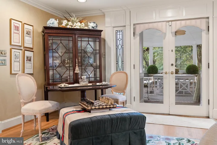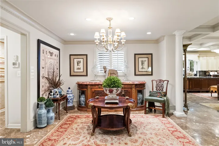 The approach begins with a gentle hilltop location and meticulously landscaped grounds framed by mature trees, setting the stage for the romantic architecture and elegant interiors. At the heart of the home, a stunning custom kitchen by Apex Homes features custom Neff cabinetry, professional-grade Wolf and Sub-Zero appliances, and an expansive design ideal for both everyday living and entertaining. The adjoining formal dining room is highlighted by a dramatic plaster groin-vaulted ceiling and walls of windows that capture serene views of the landscaped grounds and pool beyond. A sun-filled garden room opens directly to the rear terrace, blending indoor and outdoor living. The spacious main-level family room adjoins a paneled study providing the option of a first-floor primary suite.