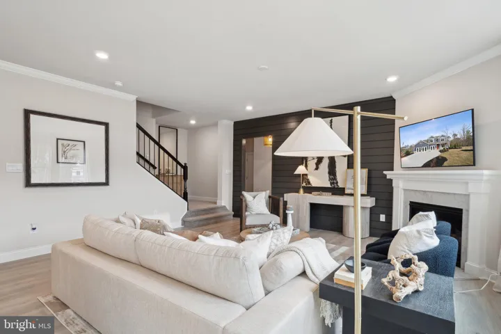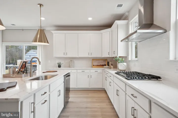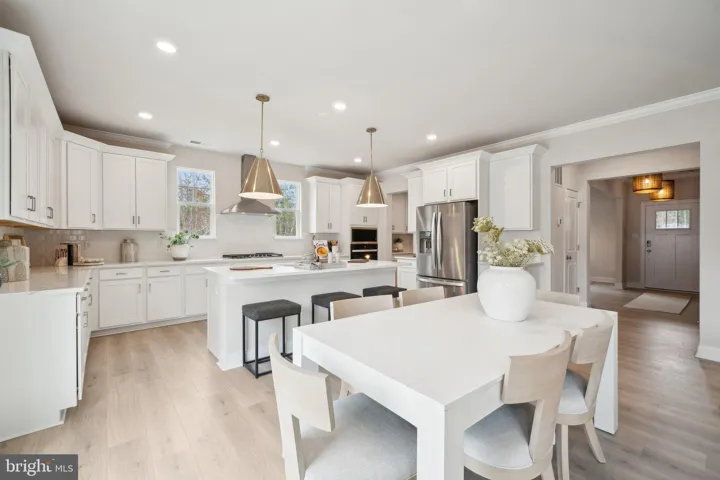 The bright and airy kitchen is a chef’s dream, featuring a spectacular center island, gourmet amenities such as stainless steel appliances, quartz countertops, and a gas cooktop, perfect for cooking and entertaining.