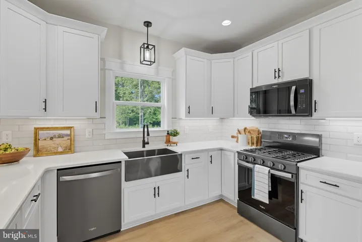 Inside, every detail has been designed for both beauty and function. The open-concept floor plan features a vaulted family room with a gas fireplace and shiplap surround, creating a dramatic yet inviting centerpiece. The gourmet kitchen offers quartz countertops, a farmhouse sink, under-cabinet lights, tile backsplash, soft-close cabinetry, a large closet pantry, and a spacious peninsula for entertaining. The family room features vaulted ceilings and a showstopping fireplace adorned with a custom mantel and shiplap design. The dedicated dining area and gracious foyer add a touch of elegance, and the large double windows and double-front door allow ample nature light into the space. LVP flooring