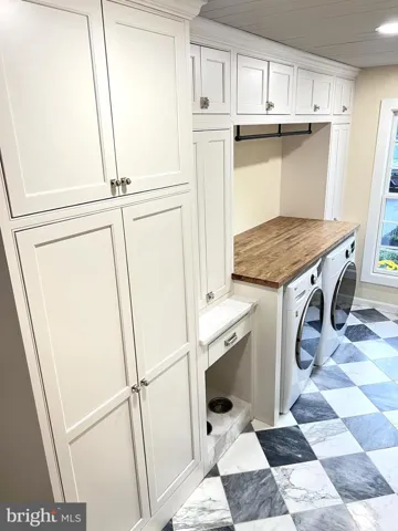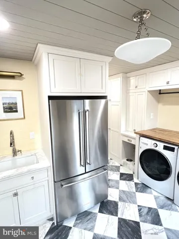 A brand-new laundry room adds both function and style, complete with custom cabinetry, a butcher block folding counter, and marble surfaces- plus a built-in dog food and water station with its own pot filler, making pet care both stylish and convenient.